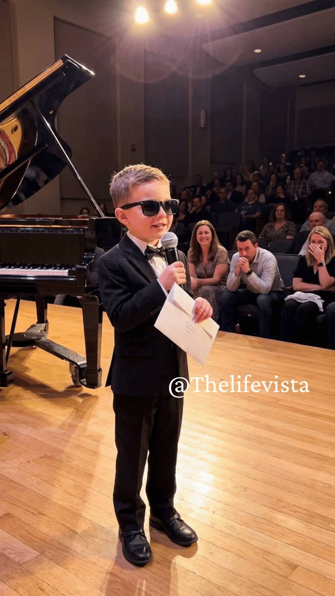 They brought Noah to the microphone for a short celebration speech. He wore his small black sunglasses and a suit jacket that made him look older than eight. Someone adjusted the mic lower. The room quieted.