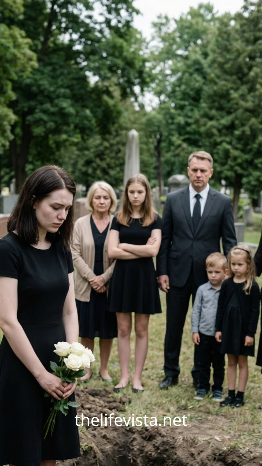 A balding man in a cheap gray suit stood beside her, holding her elbow like she needed help walking. Behind them were three kids — teenagers and one smaller boy — all of them watching the burial with wide, curious eyes.