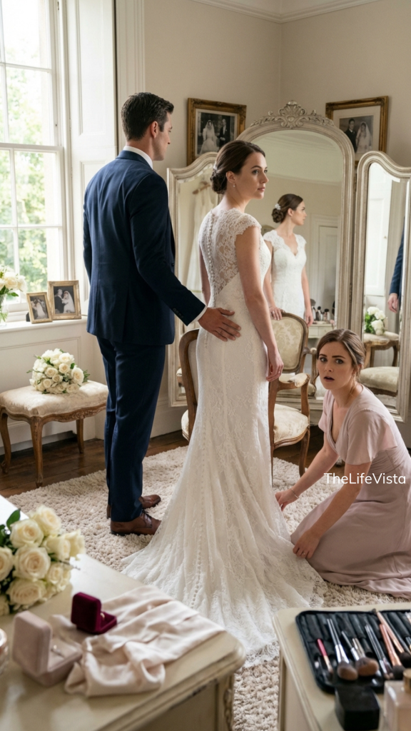 When I exhaled, I realized my hands were shaking. I went back to the bridal suite and stood just inside the door, letting my eyes adjust again to the brightness and chaos. Naomi was sitting in front of the mirror now in her full dress, veil attached correctly, lipstick reapplied. From a distance, she looked like every other bride trying to look perfect for photographs. But when I moved a little closer, I saw how rigid her shoulders were. She kept taking small shallow breaths, lifting her hand to her chest as if adjusting an invisible necklace.