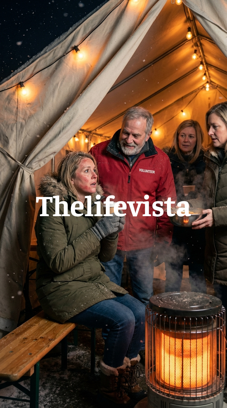 That night, the downtown parking lot had been transformed into something that almost looked hopeful from a distance—white tents glowing under strings of warm lights, volunteers laughing softly as they handed out soup, donated coats stacked neatly like kindness could be measured and distributed evenly—but from the inside, it was still just cold, temporary, and fragile, much like the lives gathered there.