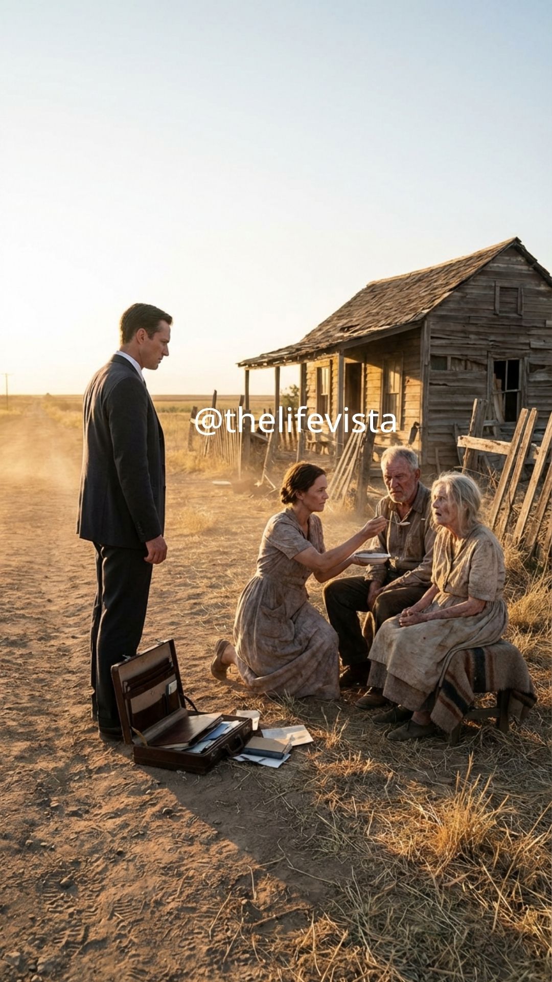 What he saw first made him angry before it made him thoughtful. Two elderly people sat outside on overturned wooden crates, both gaunt and dust-covered, wearing the exhausted stillness of people long past the point of complaint. Sophia Hayes knelt beside them, unpacked the food, and began feeding them slowly, one careful bite at a time, as though every mouthful mattered.