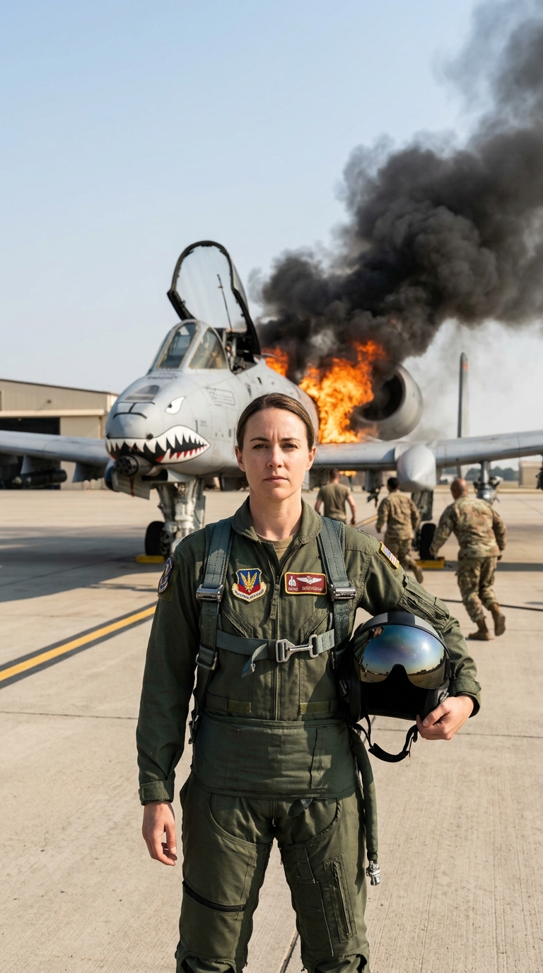 She crossed the tarmac with purpose, rainless wind carrying sand against the chain-link fence. In the far corner of the base sat a forgotten shelter marked for decommission: an old A-10 airframe under tarp and dust, the kind of plane people joked was too ugly to die.