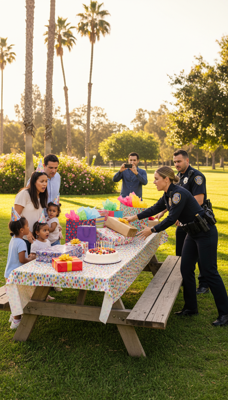 Tyrell froze near the cake table, confusion twisting into fear. Malcolm stepped forward fast, palms open. “Ma’am, we have a permit,” he said, reaching for a folder on the table. “We did everything right.”