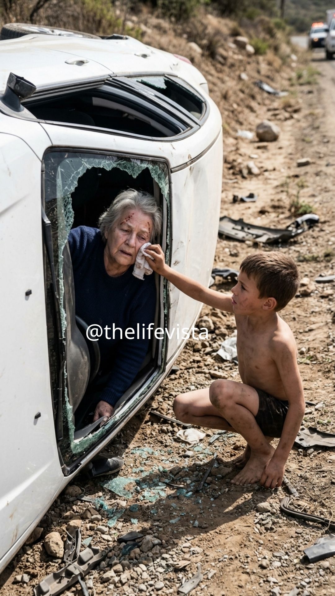 Inside, slumped against the steering wheel, was an older woman with silver hair matted dark at the temple. Blood ran down the side of her face, soaking into the collar of her blouse. Her chest rose in shallow, uneven movements.