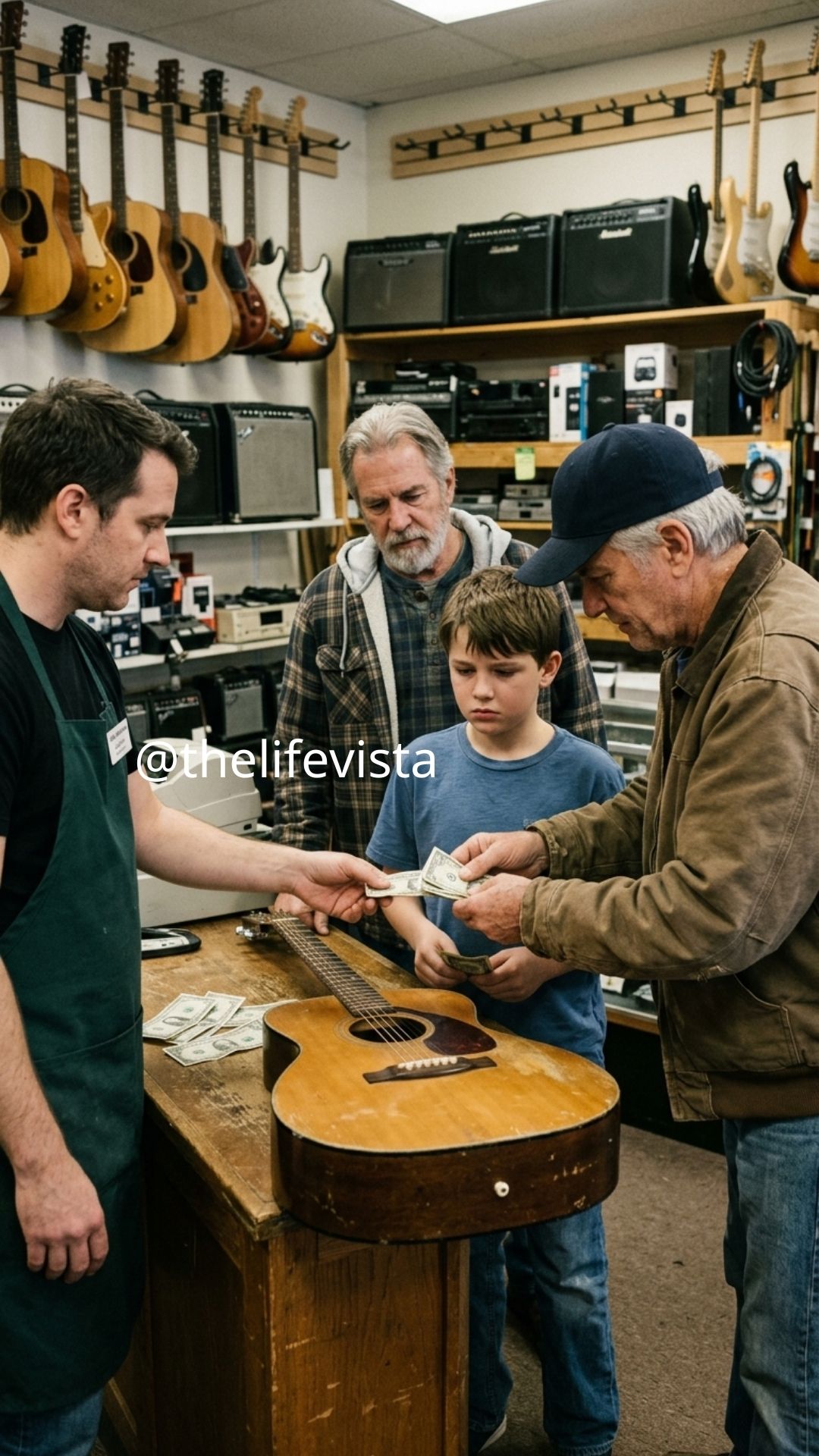“Because someone once believed in me when I was about your age,” he said quietly. “And I never forgot it,” and there was a tired sincerity in his voice that suggested he wasn’t buying a guitar so much as repaying a debt to his own younger self.