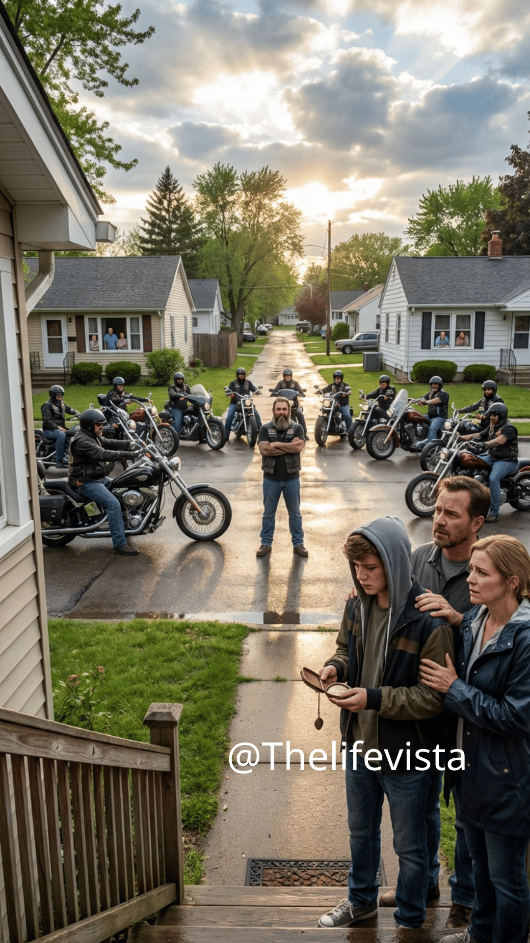 They pushed the bike under the canopy and secured it as best they could. The biker’s movements were efficient, practiced. Lucas led the way down the sidewalk, flashlight bobbing, the town empty around them like the storm had erased everyone else.