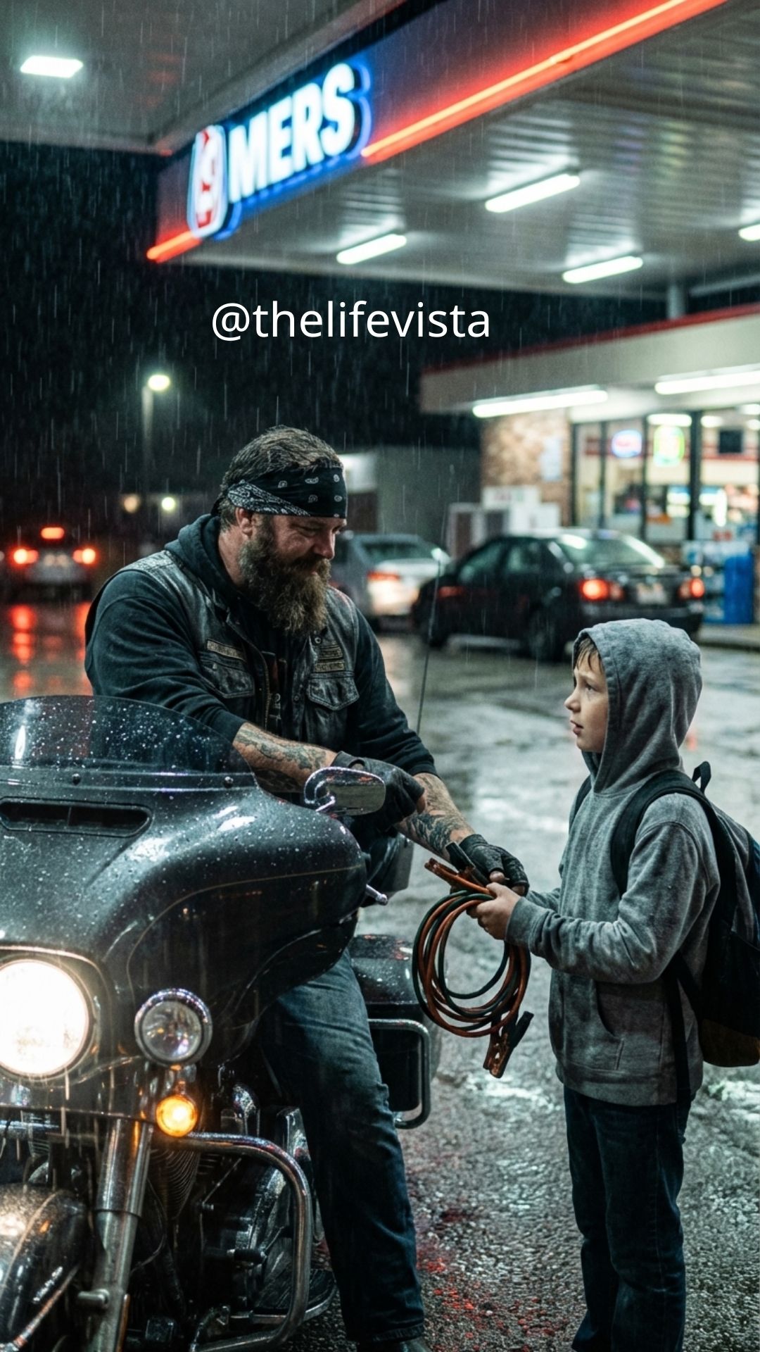 Evan swallowed and stepped closer anyway, angling the flashlight toward the exposed wires while rain ran down his neck and soaked into his shirt. He didn’t ask about the heavy rings on the man’s fingers or the faded patch stitched on his vest that read Iron Wolves MC. He just did what the man told him—hold this, keep that steady, don’t move—while minutes stretched and thunder rolled and their shadows jumped across cracked concrete.
