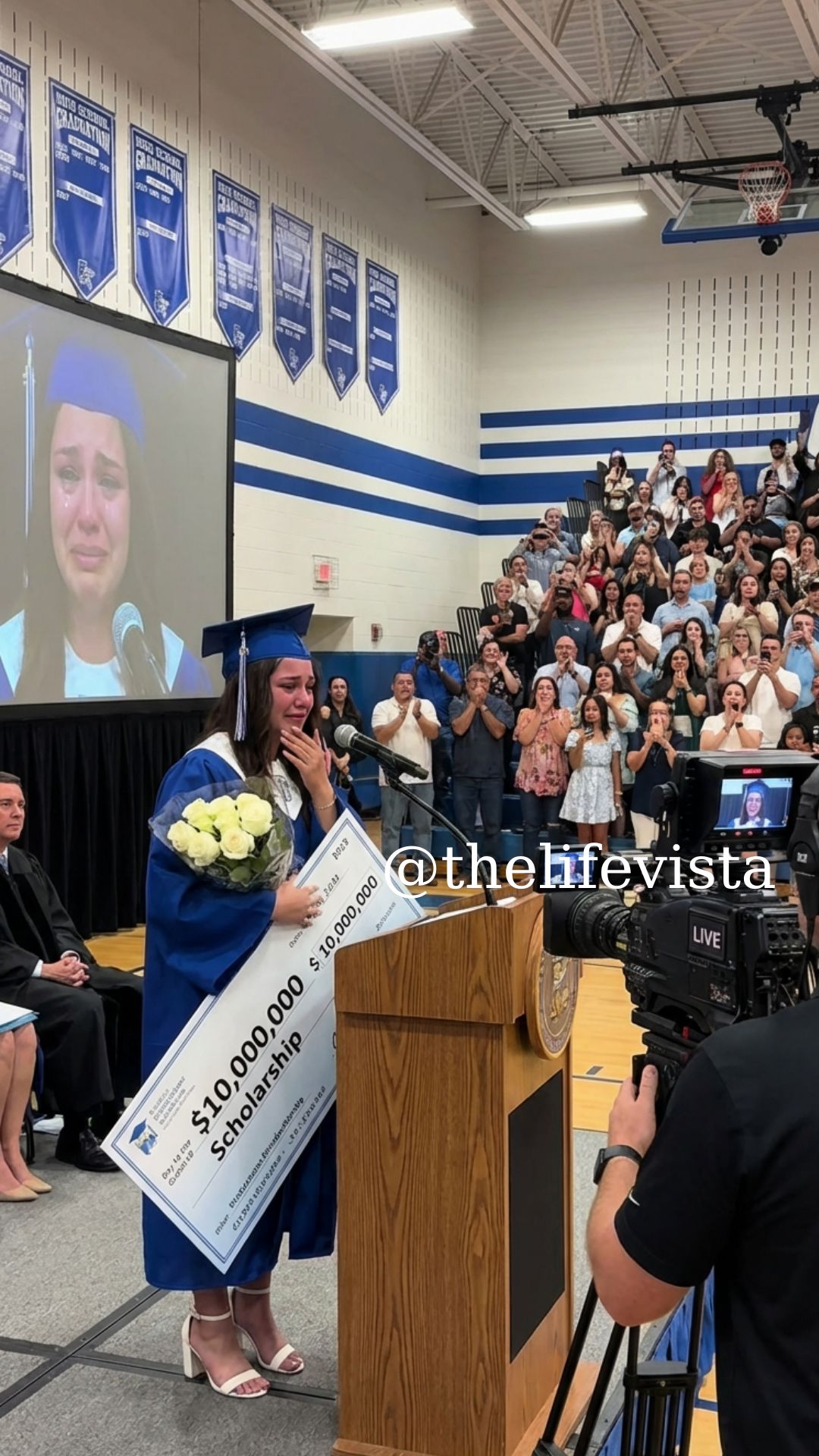 Channel 7’s anchor stepped onto the edge of the stage with a microphone. “Claire,” she said, voice warm and excited, “your story has gone viral locally. Valedictorian, first-generation college-bound, and now the recipient of a record scholarship. What’s going through your mind right now?”