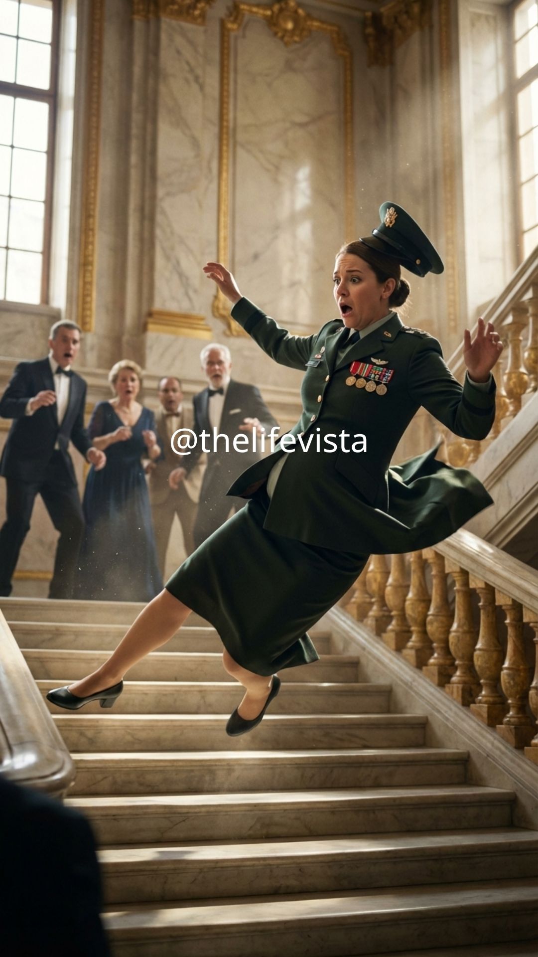 I tumbled downward, a chaotic, bone-jarring descent. I finally hit the landing at the bottom of the flight, a crumpled heap of glittering medals, torn wool, and broken pride. I curled instinctively into a tight ball around my stomach, a breathless gasp tearing from my throat.