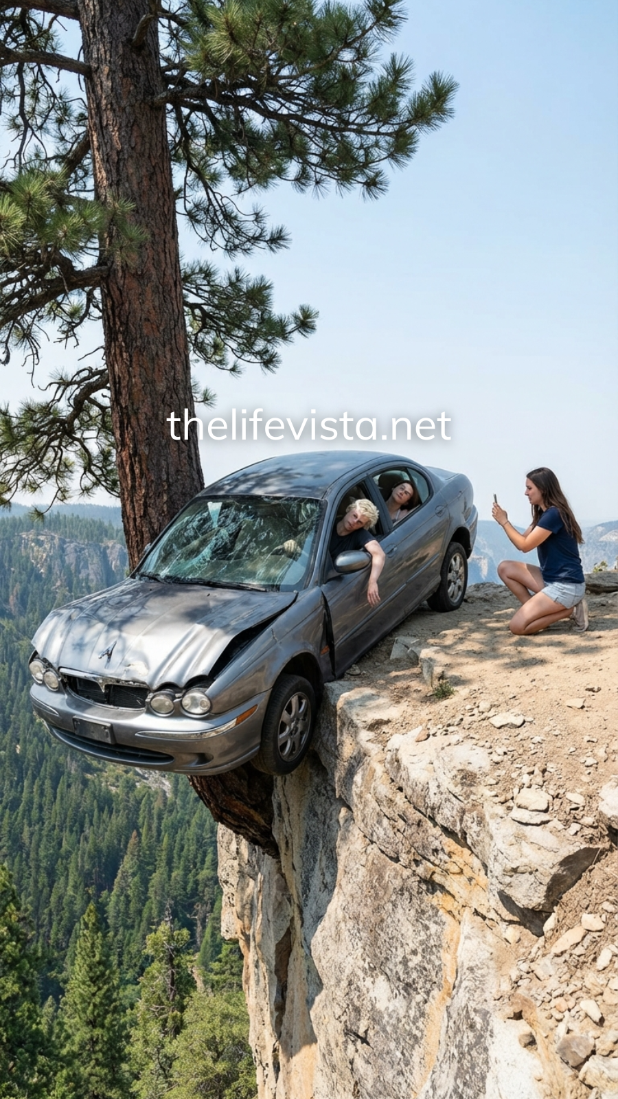 Not complete stillness. The car tilted at a nauseating angle, its rear wheels suspended over open air. The pine tree groaned beneath the weight, needles trembling, trunk bowing but holding. It was the only thing preventing them from plunging into the abyss below.