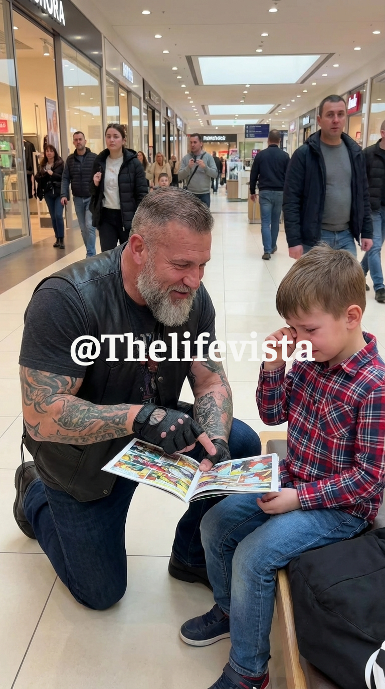 “Parents Grabbed Their Kids and Backed Away as the Battle-Scarred Biker Walked Through the Mall—But When He Knelt Before a Sobbing Child and Pulled a Rare, Weathered Comic from His Leather Vest, the Entire Crowd Froze in Silence, Realizing the ‘Monster’ Was the Only One Who Knew How to Save the Boy’s World.”