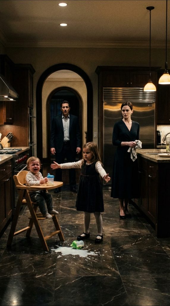 Vanessa’s voice cut through the silence with quiet anger. She gestured toward the milk on the floor with visible irritation. “Look at this mess,” she said sharply, her tone edged with frustration. “Do you even understand how expensive this flooring is?” Lily trembled but refused to move aside.