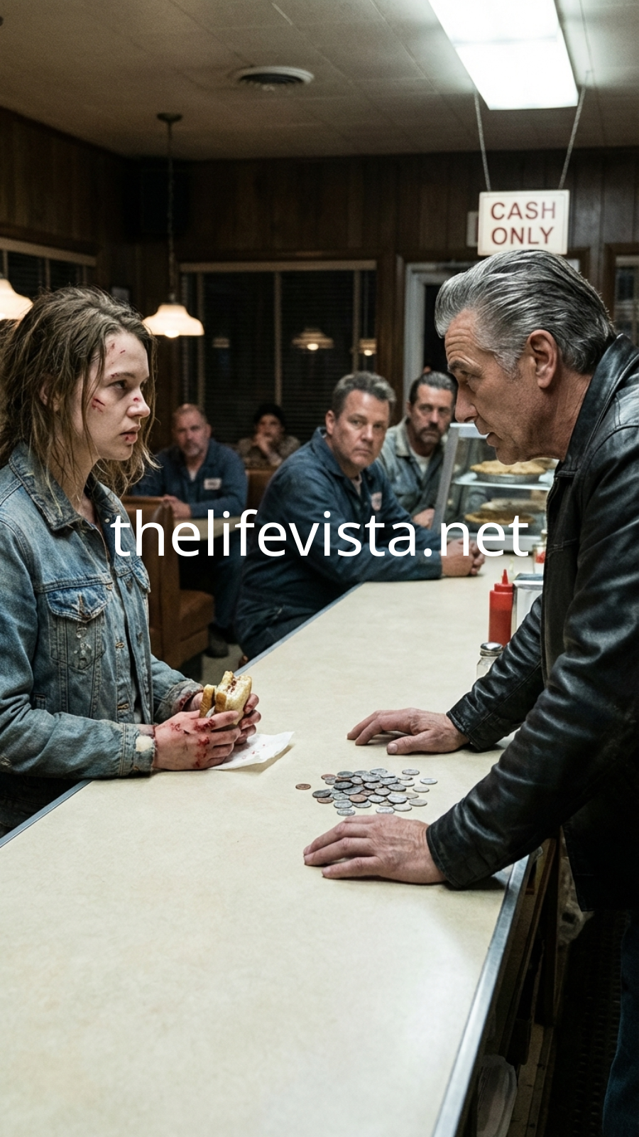 The child standing there couldn’t have been older than eight. She was barefoot, trembling, a thin nightgown clinging to her small body, torn at the hem and soaked through by rain. Her hands were red—completely red—shaking as she pushed forward a crumpled wad of dollar bills.