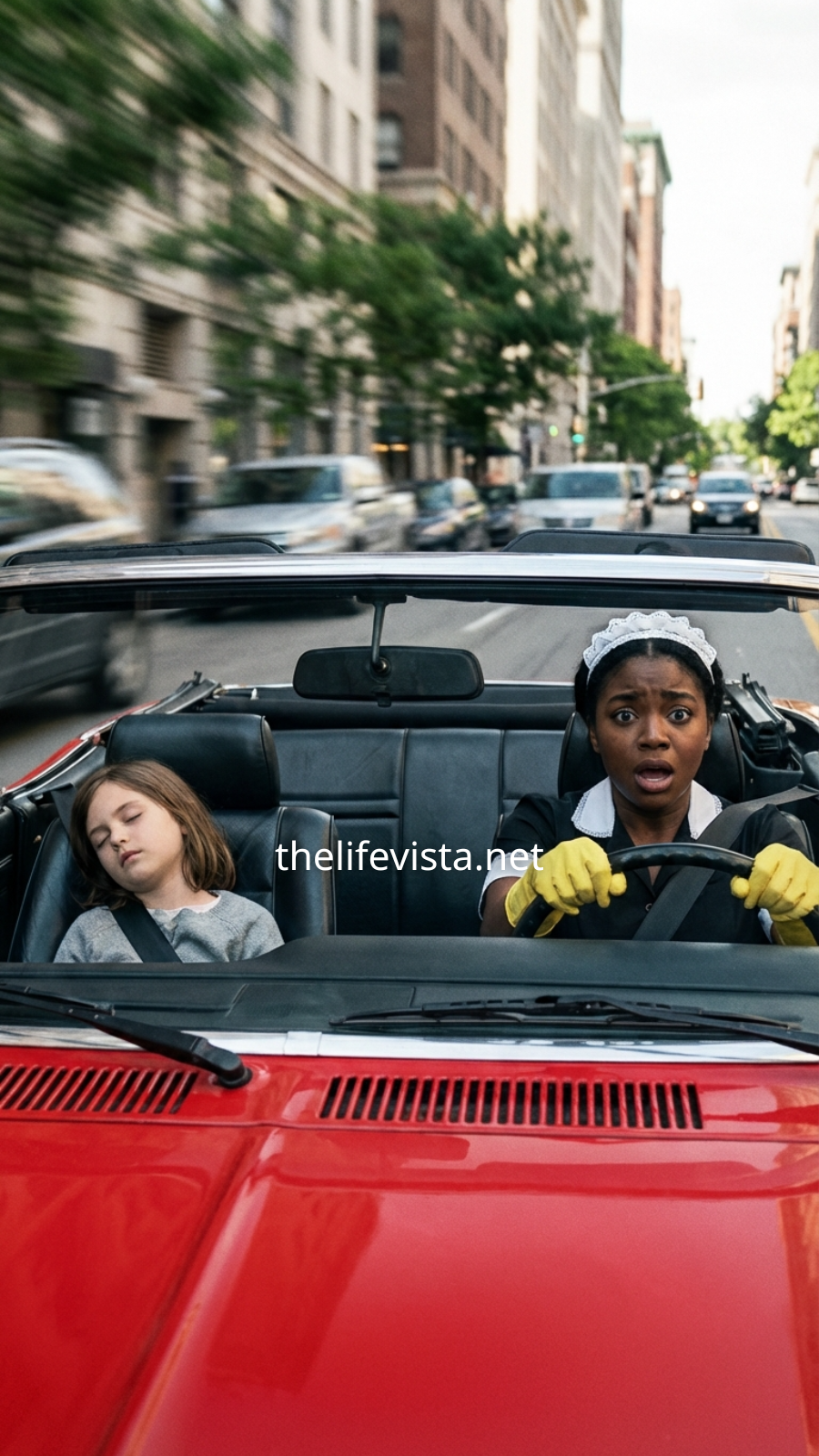 The roar of a bright red Ferrari engine shattered the quiet calm of the suburban street. Curtains twitched as neighbors rushed to their windows, staring in disbelief as the luxury car tore past at dangerous speed. Behind the wheel sat a maid, her white apron fluttering wildly through the open window, yellow cleaning gloves still gripping the steering wheel. In the passenger seat, a young girl lay slumped and unconscious, her pale face resting awkwardly against the seatbelt.