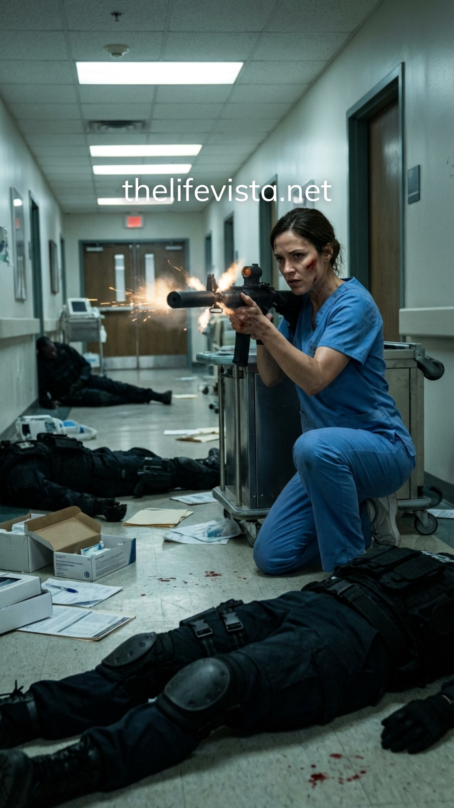 The hospital itself became her ally. She triggered alarms that forced doors to seal. She cut off their clean path to the room they wanted. She used safety systems to make air and visibility unpredictable—enough to slow them, never enough to endanger the patients she’d sworn to protect.