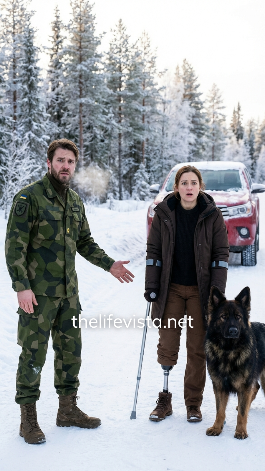 She leaned heavily on a pair of crutches, her movements measured and careful. One leg was gone, replaced by a prosthetic concealed beneath fabric already darkened by snow and moisture. Beside her walked a German Shepherd—large, powerful, alert. Its thick black-and-tan coat was dusted with frost, ears pricked, body angled protectively toward her as though daring the storm to come closer.