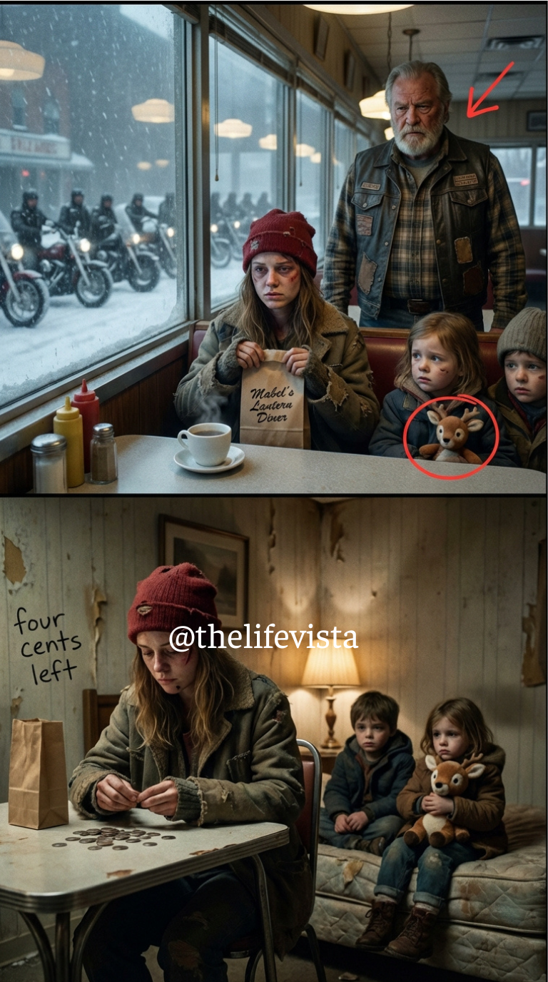 Kellan and Lyra stayed close, tucked behind her coat like two little shadows. Kellan’s cough was dry and stubborn. Lyra didn’t cough. Lyra clutched a small stuffed reindeer with one missing eye and watched plates of food drift past like they were on another planet. The diner smelled like burnt bacon and coffee and wet wool drying by the heater. The radiator behind the counter clicked steadily, a metronome for the last 10 minutes of the night.