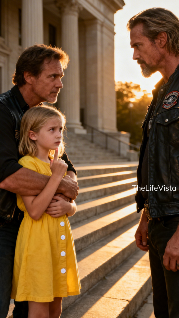 Now picture this: a little girl in a yellow dress, eight years old, walking beside a man who wasn’t her father. Eleven people walking past. One Hell’s Angel who stopped on the third step and understood what her fingers were saying.