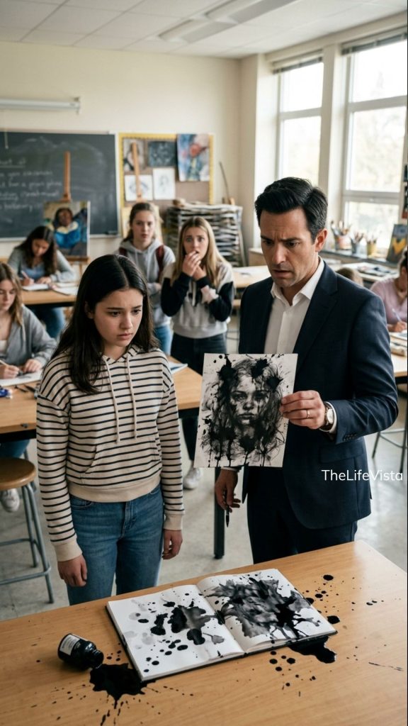 I was still frozen by my desk. My graduation sketchbook lay open and bleeding black across the pages. Ink pooled in the center fold. My shirt was stained. My fingers were shaking. And Victoria, who had looked so thrilled with herself ten seconds earlier, suddenly seemed unsure whether she was still the star of the scene or the first girl in school history to accidentally vandalize something she should have feared.