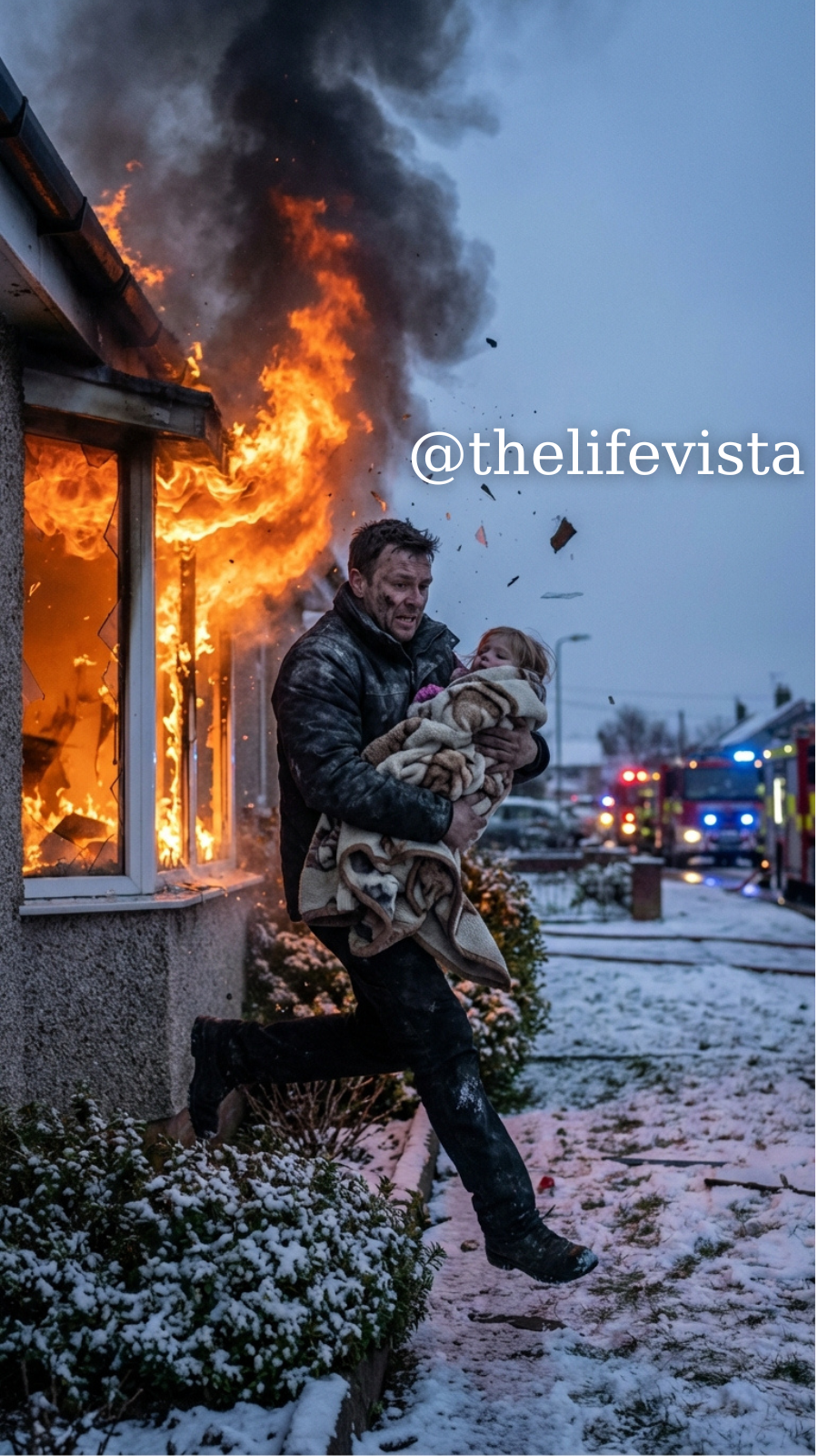 He grabbed the blanket off the bathroom rack, soaked it under the tap for half a second that felt like theft, wrapped it around both of them, and when the staircase behind them bloomed into flame, he did the only thing left: he ran toward the window.