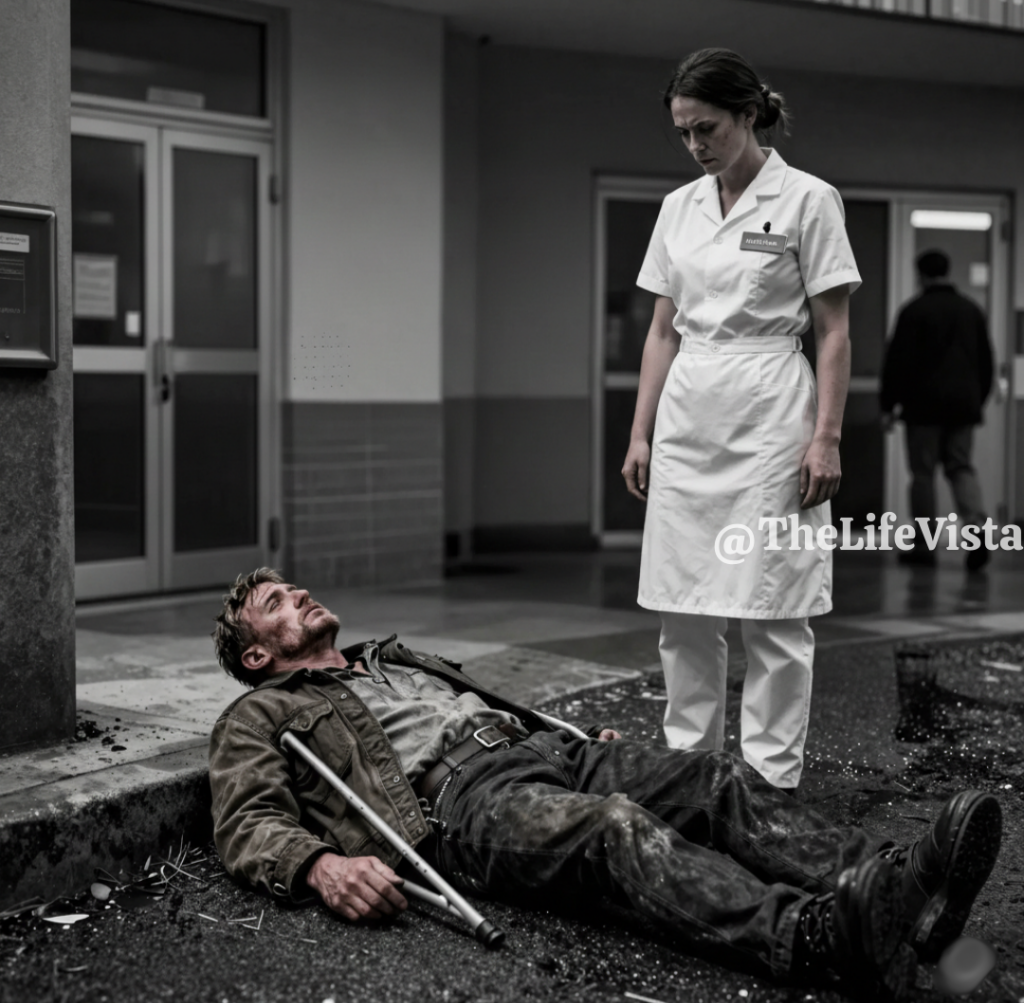 His back hit the pavement like a detonation—all the old shrapnel waking up at once. His crutches skittered across the concrete. He lay there looking at the gray November sky above the entrance of the hospital he’d once bled to protect.