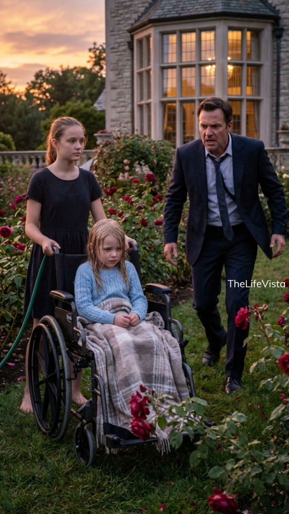 In the middle of the rose garden, his seven-year-old daughter Sophie sat in her wheelchair, drenched beneath a stream of cold water. Her small body shivered under a pale sweater and blanket. Wet strands of brown hair clung to her cheeks. Beside her stood Nora, the new maid—barefoot, silent, barely sixteen—holding a garden hose as if this were the most natural thing in the world.