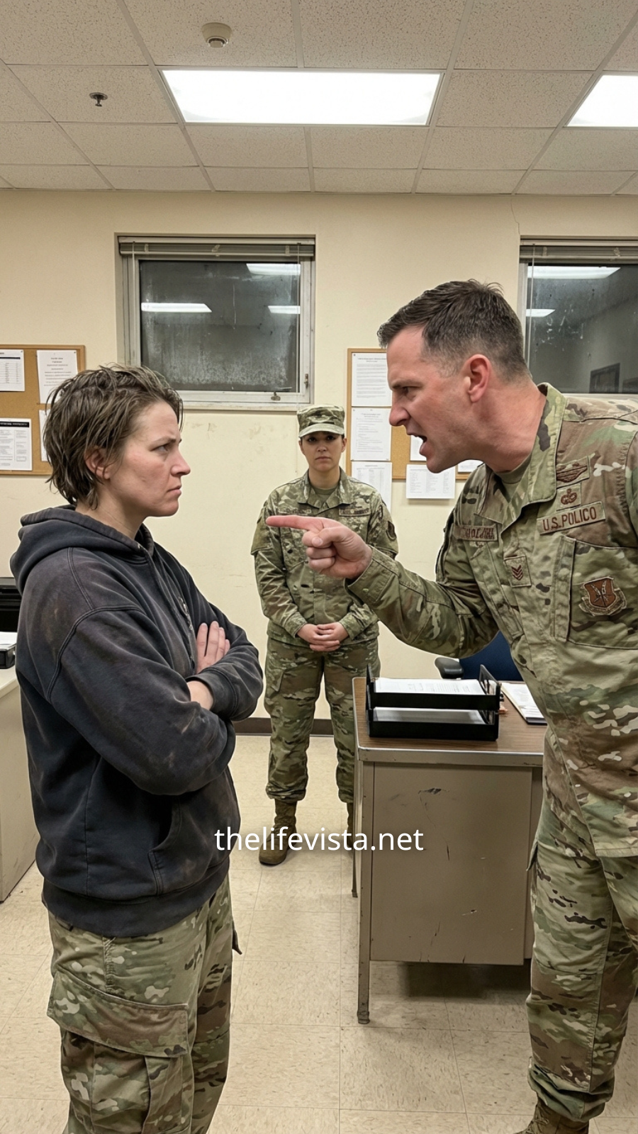 Inside, the grinding pace of the day didn’t slow. Phones still rang, printers still jammed, and requisitions still crawled through the system like wounded animals. Major Holloway stood over Leah’s desk, rubbing her temples.