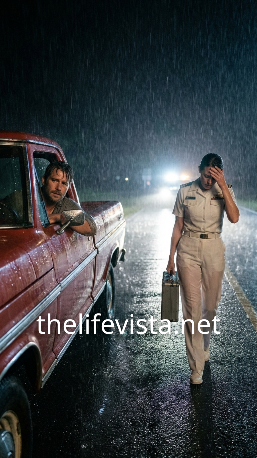 A dark government sedan sat crooked near the curb outside the naval administrative building, hazard lights blinking weakly through the storm. Steam curled from beneath the hood like a warning signal. Beside it stood a woman, soaked to the bone, one hand braced against the door as if the rain itself were trying to push her to the ground.