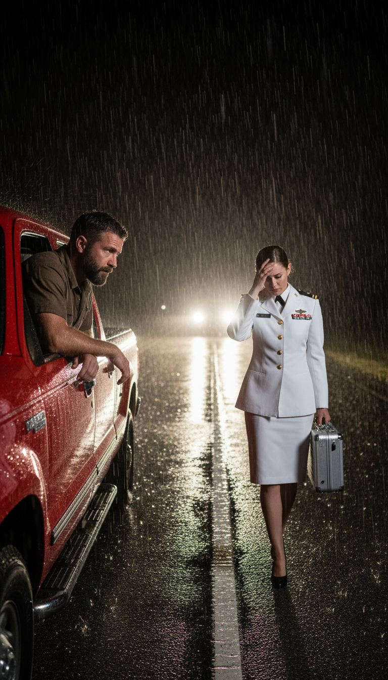 She turned. Her face was pale but composed, eyes sharp despite the rain. Her uniform jacket was unmistakable—Navy. Senior rank, though Marcus didn’t know enough to read the insignia.