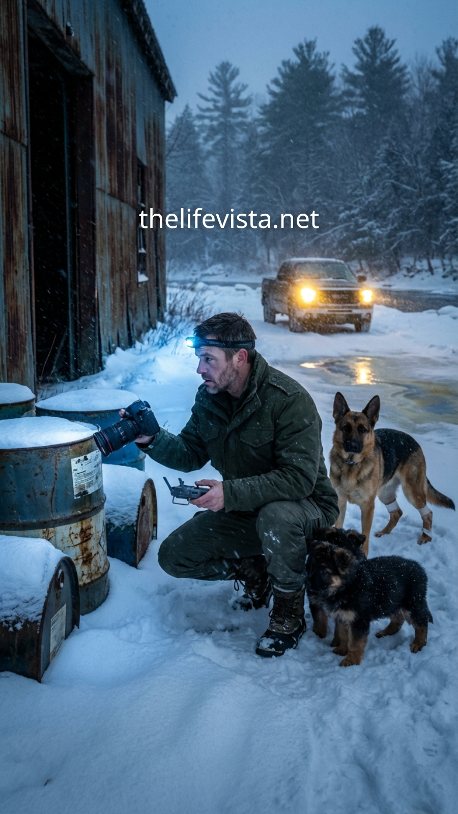 Behind her, two tiny puppies huddled together, frostbitten paws tucked close, their bodies trembling like fragile candle flames in a gust of wind.