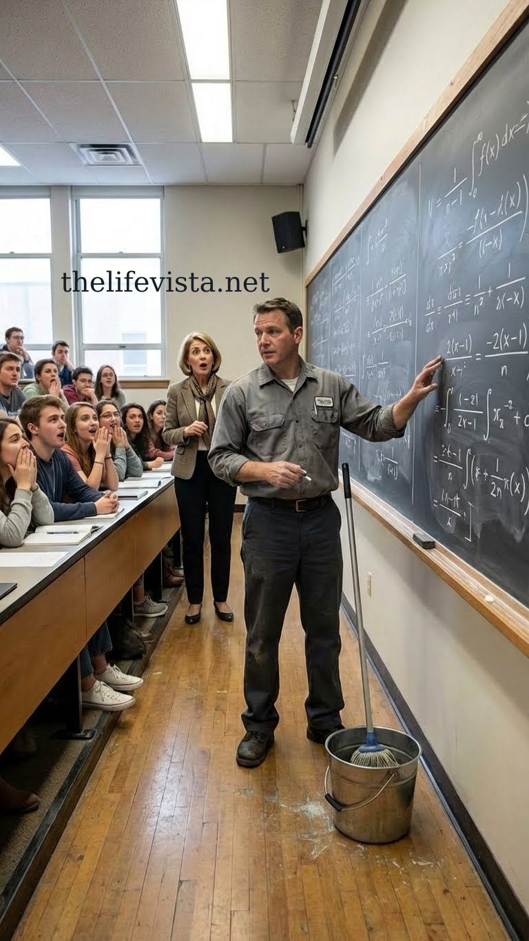 The room fell completely silent. Twenty-two students turned to stare at the janitor who’d just corrected their brilliant professor. The silence stretched like a taut wire about to snap.