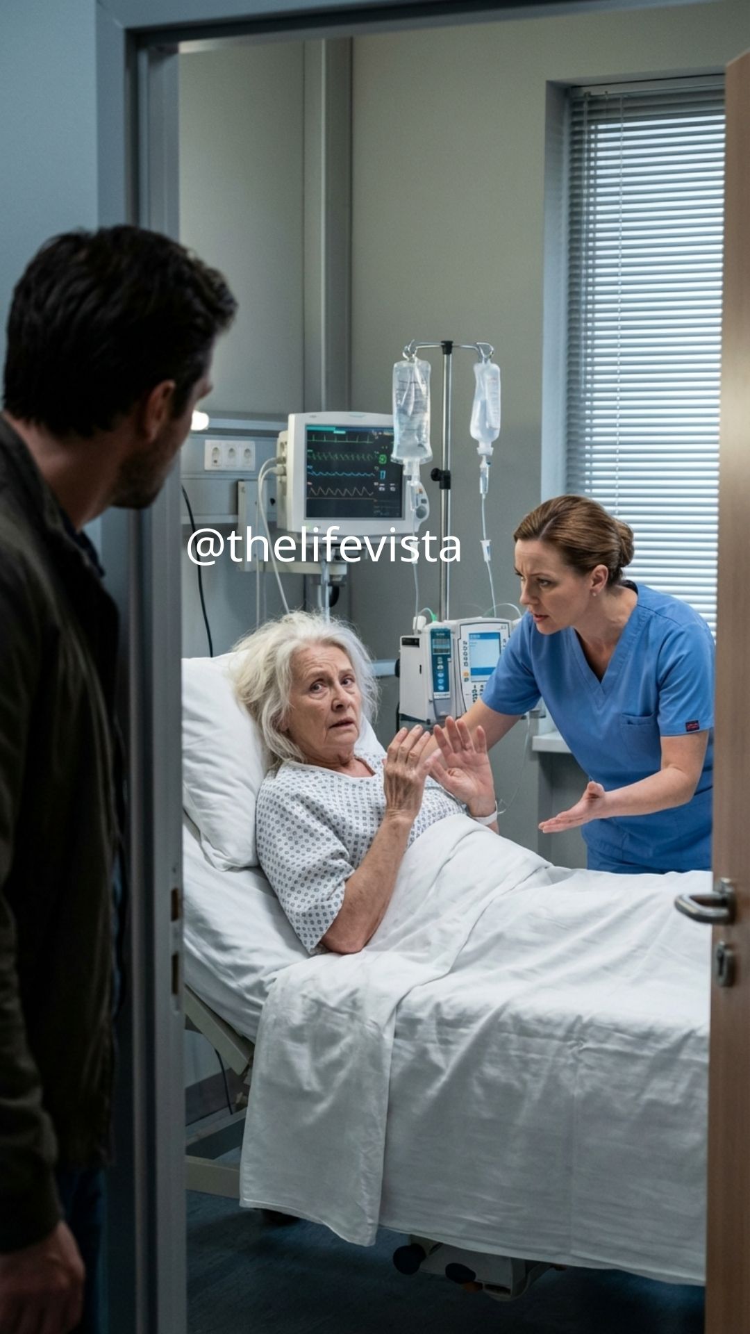 For a moment I stood frozen in the doorway, staring at the scene unfolding inside. My mother sat on the hospital bed, her thin shoulders hunched beneath a pale blue gown. Her silver hair was pressed against her cheek, and one hand hovered in front of her face like a shield. Standing beside the bed was a nurse in white scrubs. Her palm was still raised. Something inside me shifted from surprise to something colder, deeper, and more dangerous than anger, because there is a special kind of fury that comes from seeing the person who taught you gentleness forced to defend herself against cruelty.