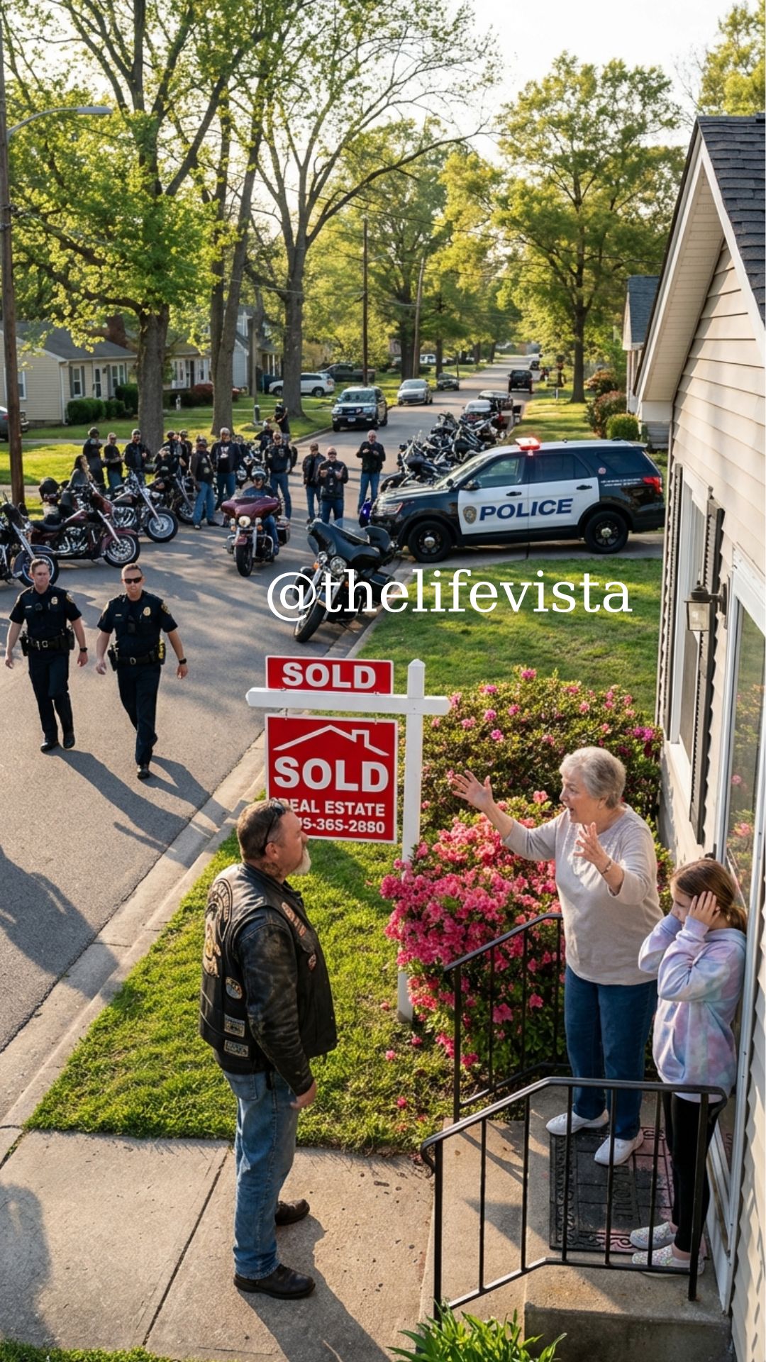 “Step away from the child!” the officer shouted as the biker slipped his hand inside his vest. Behind him, motorcycle engines ticked as they cooled, and a little girl sobbed on the porch. Then the biker answered calmly, “We’re here because the court ordered it.”