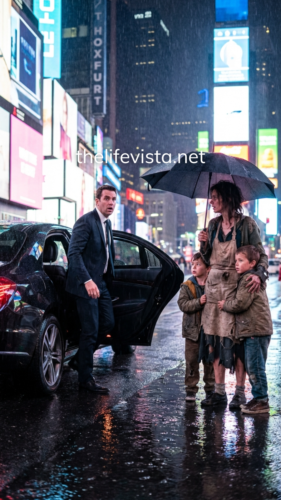 A woman stood on the sidewalk holding two children close beneath a torn coat, trying to shield them from the cold rain.