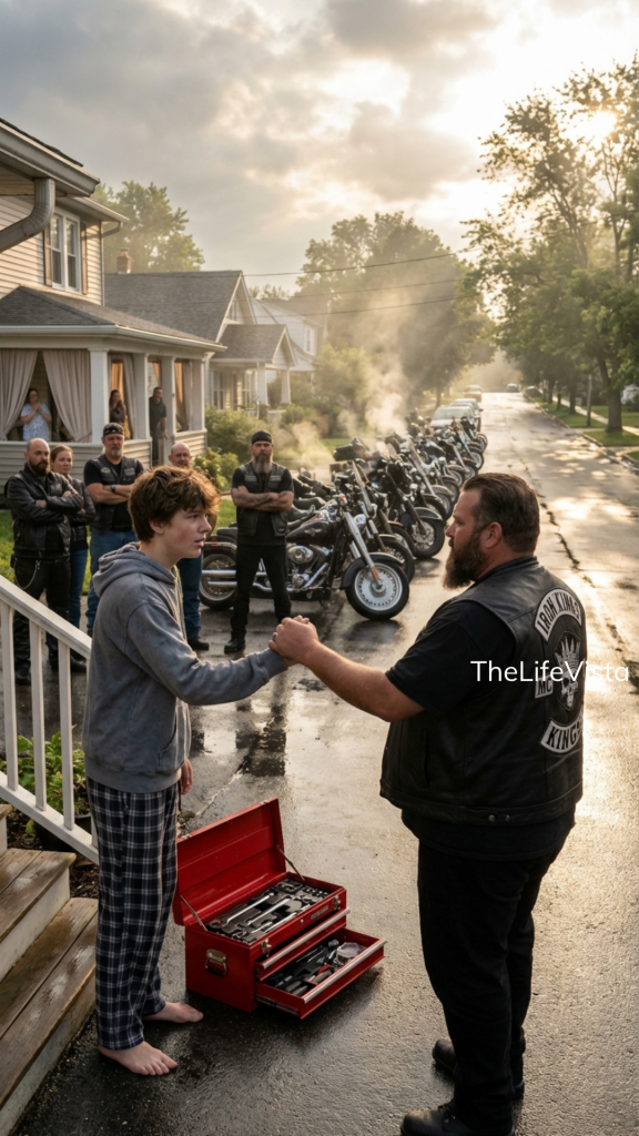 They walked together through the storm, Liam guiding while the stranger pushed the heavy black bike beside him. It felt surreal, like stepping into someone else’s life. When they reached Liam’s house, he lifted the garage door, and the man rolled the motorcycle inside, bringing with it the smell of oil, gasoline, and wet leather.