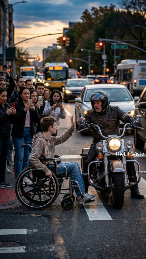 Thin, maybe fourteen, sitting in a wheelchair that looked like it had been repaired again and again instead of replaced. The metal frame bore scratches, one handle wrapped in worn athletic tape, and the wheels didn’t glide the way they should. He didn’t belong in the middle of that intersection. He looked like someone who should have stayed safely on the curb.