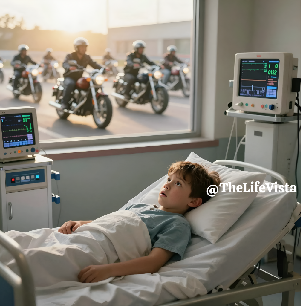 Every week a group of motorcycles slowed down outside the hospital in a way that seemed almost deliberate, though none of the staff fully understood why. The building stood beside a quiet road that curved around the edge of the hospital grounds, a road mostly used by delivery vans and the occasional ambulance. Yet every Saturday afternoon the same deep engines rolled through, rumbling in a steady formation that echoed between the concrete walls. To most people it was simply background noise that faded after a few seconds. To one child watching from a window above, it meant everything.