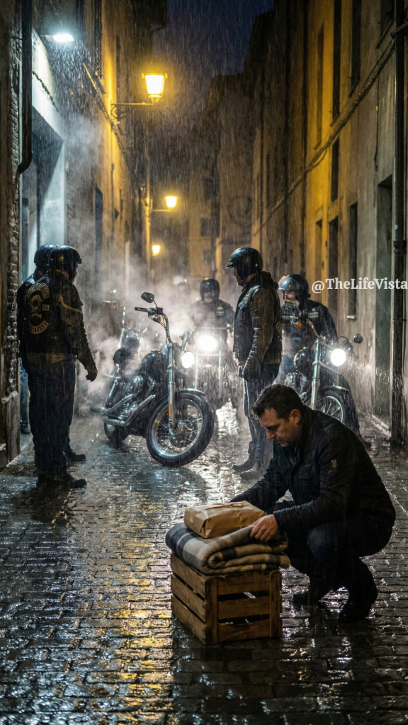The man was broad-shouldered and rain-soaked, leather vest darkened by water and stitched with patches that spoke of something organized and tight-knit. Behind him stood several others, forming a loose half-circle that felt less like a trap and more like a wall against the wind. Their motorcycles lined the mouth of the alley, engines now silent.