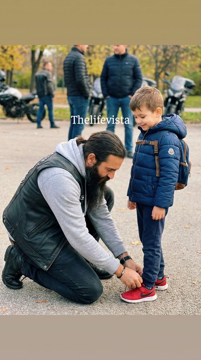 From their angle, all they saw was a broad-shouldered man with a shaved head, a weathered leather jacket, and tattooed forearms crouched at a child’s feet.