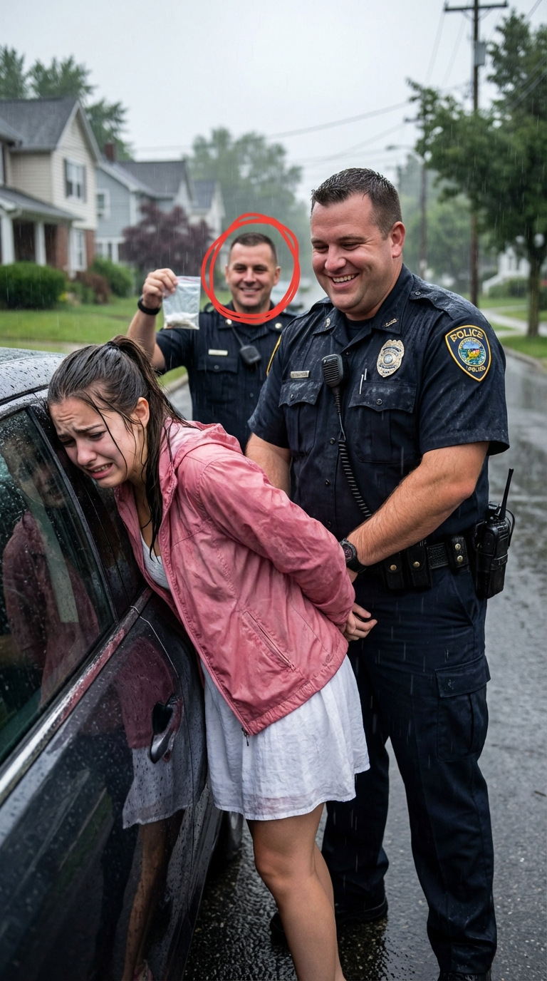 Jade complied, stepping into the rain. Her hoodie darkened instantly. Maddox circled the car with the swagger of someone who enjoyed being feared. His junior partner, Officer Owen Price, stayed near the cruiser, watching with a tight, uneasy expression.