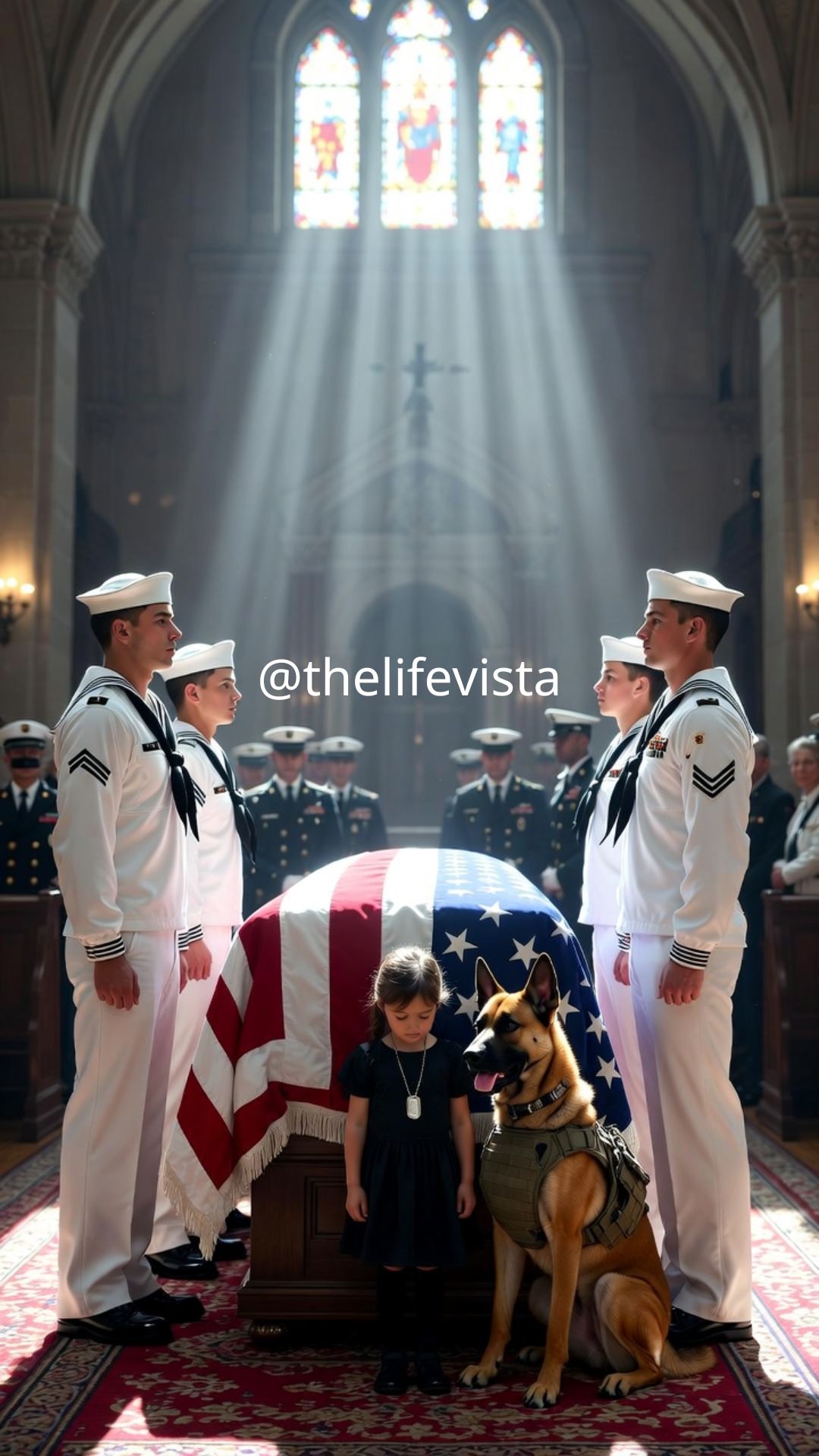 Mia approached the coffin. She placed her hand on it, her movements slow, deliberate, as though she understood the weight of what she was doing even if she couldn’t fully articulate it. Jax stepped aside. Not far. Just enough. Then, gently—so gently it didn’t seem possible for a dog built for war—he lowered his head against her shoulder. The room fell silent. Not the polite, controlled silence of a ceremony. A different kind. The kind that happens when something doesn’t make sense and everyone feels it at the same time, when the carefully constructed order of the day begins to crack under the pressure of something far more powerful than protocol.