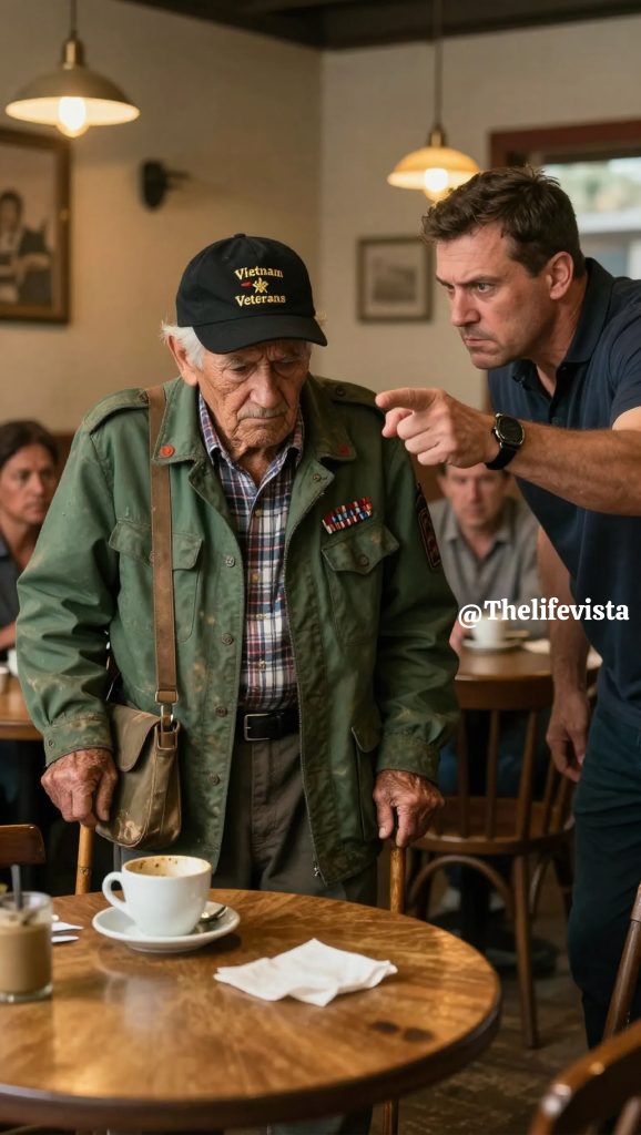 The dismissal did not arrive with shouting or open hostility, but in the softer, more cutting form that disrespect often wears when it believes itself justified, sliding into the room on polite phrasing and thin smiles while the harm settled anyway. The café was called Copper & Ember, a fashionable stop in a Pennsylvania town that liked to advertise its values with reclaimed wood, carefully curated playlists, and customers who prided themselves on appearing enlightened while quietly measuring who belonged and who did not. The elderly man occupied a small corner table near the wall, his posture upright in a way that spoke of long habit rather than comfort, his weathered hands wrapped around a chipped mug whose heat he did not seem to notice, his coat clean but worn thin at the seams and elbows, his boots old yet meticulously cared for, suggesting discipline and routine rather than neglect. From the moment he had entered, eyes had followed him with the reflexive curiosity reserved for those who do not blend easily into polished spaces, and the low hum of judgment began to spread between tables faster than the steam rising from the espresso machine, with whispers asking whether he was homeless, whether he smelled of stale smoke, whether someone like that should really be allowed inside a place like this. His name was Arthur Langford, he was seventy-six years old, and he had served his country long enough to carry the memories permanently etched into the slight tremor of his hands, a tremor that came not from age but from recollections that never truly released their grip. He stared at the surface of the coffee without lifting it, as if the simple act of sitting quietly had become an invitation for scrutiny, and when the young barista approached with a smile that strained at the edges, she asked in a gentle tone sharpened by expectation whether he intended to order anything else, to which Arthur replied slowly and politely that no, this was sufficient for him, and her nod came with a glance toward the counter that communicated far more than her words. A moment later the owner appeared, a man named Julian Mercer in his mid-thirties with a carefully trimmed beard, an expensive watch, and the restless impatience of someone accustomed to control, who owned multiple cafés and valued atmosphere and image above all else, and he spoke calmly but loudly enough to be overheard when he said he would need to ask Arthur to leave. Arthur blinked once, his expression measured rather than shocked, and answered that he had paid and was not disturbing anyone, only to receive a practiced response about complaints from other customers and how his presence was making people uncomfortable, a phrase that landed heavily in the silence as nearby patrons avoided eye contact and pretended interest in their phones. Arthur nodded, acknowledging the familiar conclusion without argument, and reached into his jacket pocket with careful movements that made Julian tense reflexively, prompting a quick interjection that there was no need for anything dramatic, at which point Arthur set a worn leather wallet on the table and asked, still politely, whether he might finish his coffee in five minutes. Julian exhaled in visible annoyance and replied that he could do so outside because this was a business, and although Arthur’s jaw tightened, he did not raise his voice or protest, instead standing slowly while his joints protested, aware of the quiet attention of the room that had transformed into a jury without ever announcing itself, and as he turned to leave, the wallet slid from the table, struck the floor, and spilled open so that an identification card skidded into view, prompting Julian to bend instinctively to retrieve it, an automatic gesture that halted the moment his eyes fell on the name printed there. The café seemed to lose its sound all at once as Julian stared at the card in his hand, reading the name again and again as if repetition might change it, and his breath caught mid-inhale when he realized it did not, because the identification clearly read Brigadier Arthur M. Langford, United States Army, Retired, complete with a service number that confirmed it was no novelty, no mistake, and the quiet murmur of the room dissolved into an uneasy hush as Julian whispered a denial under his breath. Arthur turned back at the sound, asking calmly whether there was a problem, and Julian looked up at him with a pallor that had not been there moments earlier, his voice rough as he asked whether Arthur Langford was indeed the officer whose name appeared on the card, to which Arthur answered simply that he had been, a long time ago, and Julian’s hands began to shake as he explained that his father had served under that name, that his father had been assigned to the same battalion overseas, and when Arthur asked for the man’s name, Julian replied that it had been Samuel Mercer, at which point something shifted in Arthur’s eyes, a recognition that carried weight and sorrow rather than surprise, and he spoke the name with care, recalling the courage of a man who had done his duty without hesitation. Julian swallowed hard as he admitted that his father had never returned home, and the room listened now with a reverence that had not existed before, while Arthur straightened his shoulders and said that Samuel Mercer had saved his life, pulling him from danger under fire and taking the blow meant for someone else, a truth that left Julian blinking back tears as he confessed that his father had written about Arthur, describing him as a leader who refused to abandon his people, and Arthur lowered his gaze to the floor and replied that he had failed the man regardless, a statement Julian rejected immediately, insisting that the sacrifice was not Arthur’s failure to bear, as the barista covered her mouth and a customer lowered a forgotten phone that had been recording moments earlier. Julian returned the identification with hand