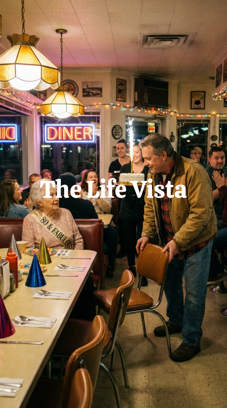 The diner was called Maple & Main, one of those old-school neighborhood spots wedged between a laundromat and a hardware store, the kind of place that smells permanently of syrup and coffee grounds and has laminated menus so thick you could probably use them as roofing material, and on that particular Friday it was packed to the edges, families squeezed into booths, college kids hovering by the pie display, servers weaving through the crowd like dancers who had memorized the choreography of chaos, and in the center of it all—Table 12, pushed together from three smaller tables—sat a woman in a pale blue cardigan wearing a glittering sash that read “80 Years Loved,” which might have been true once upon a time but did not look especially convincing under the fluorescent lights.
