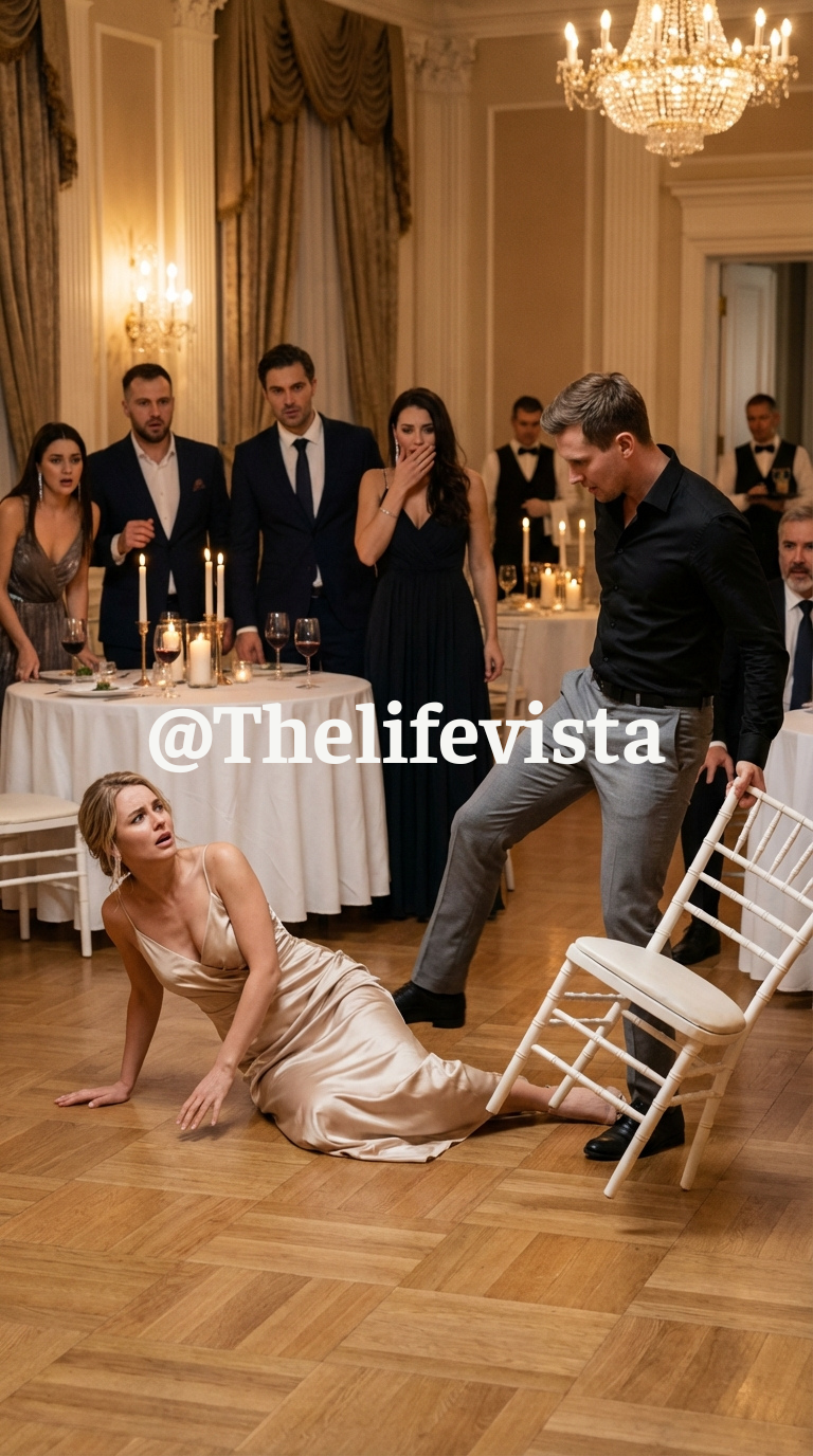 His hand hit the back of my chair. Hard. The chair slid. My heel caught the rug. I fell sideways, my shoulder slamming into the hardwood floor. The impact echoed louder than anyone’s gasp. I looked up. They were all frozen. Watching.