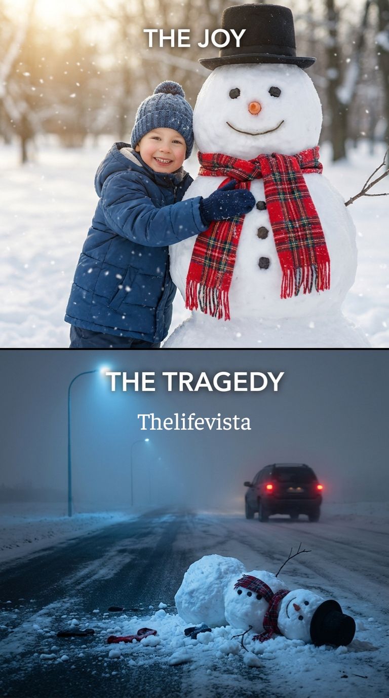 When I pulled in that evening, the headlights of my car illuminated fresh, deep tire tracks leading directly through the center of the snowman, scattering the coal eyes into the grass.