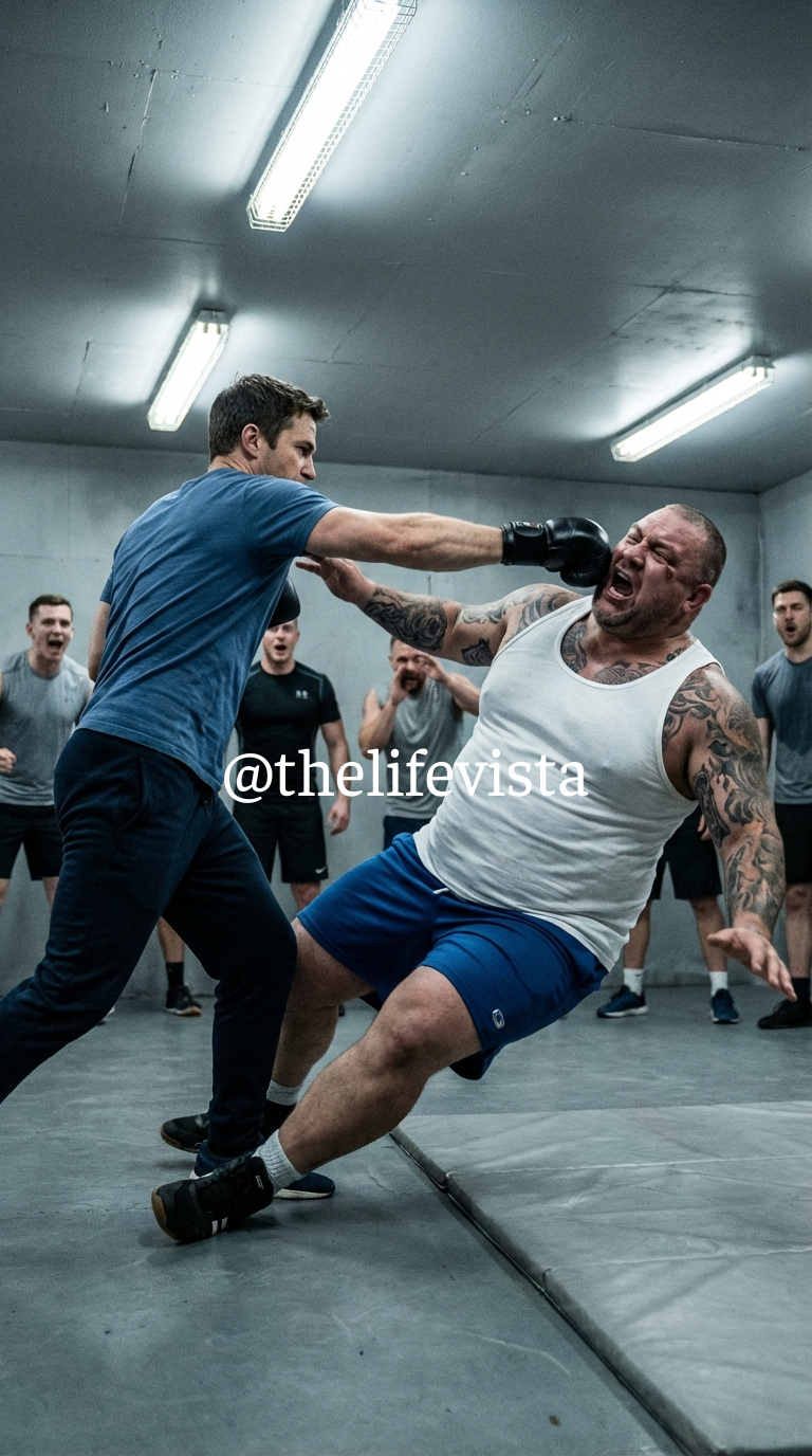 He ducked, spun, and struck Ray’s ribs with a short, precise elbow. A dull crack echoed through the gym. Ray stumbled back, gasping. Before he could recover, Marcus was already on him — a blur of motion, calm and surgical. A knee to the chest. A palm to the throat. A leg sweep that sent the giant crashing to the ground.