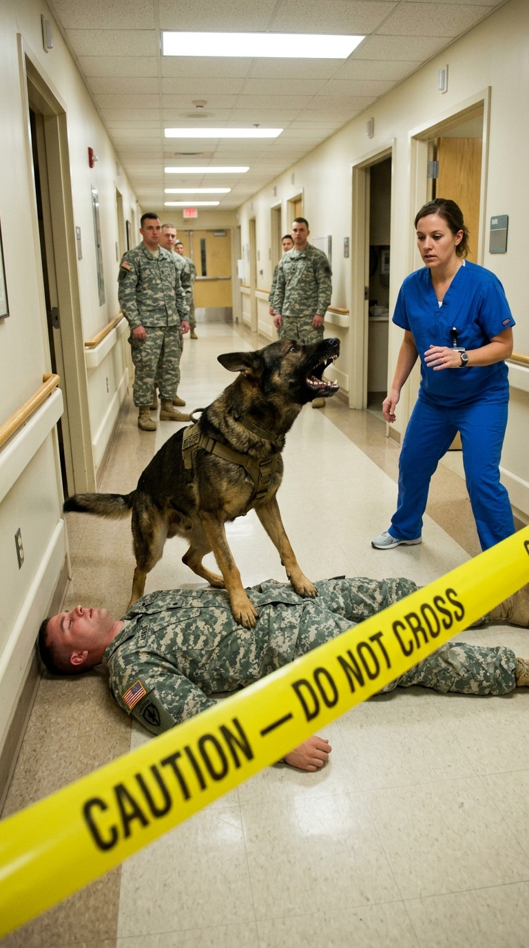 The doors burst open, and the first gurney came in fast. A man in tactical gear lay motionless, chest wrapped, blood seeping through dressings that couldn’t keep up. Behind him, handlers struggled with a Belgian Malinois in a military harness, teeth bared, body coiled like a spring.
