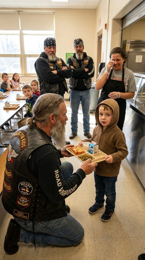 “We’re here for the veterans’ outreach lunch,” the tallest said politely when the lunch lady looked up. “Principal said we could eat with the kids.” Relief softened her expression as she nodded and handed them trays. At the register, another red screen flashed for a different student with a larger balance. The lunch lady began to explain, but the gray-bearded biker lifted his hand gently.