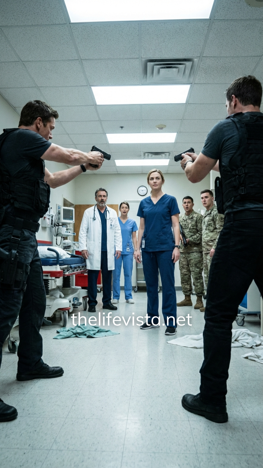 The gunshot tore through the ceiling tiles with a violent crack, punching a dark hole in the white panels and sending a cascade of powdered plaster drifting down onto the emergency room floor like dirty snow.