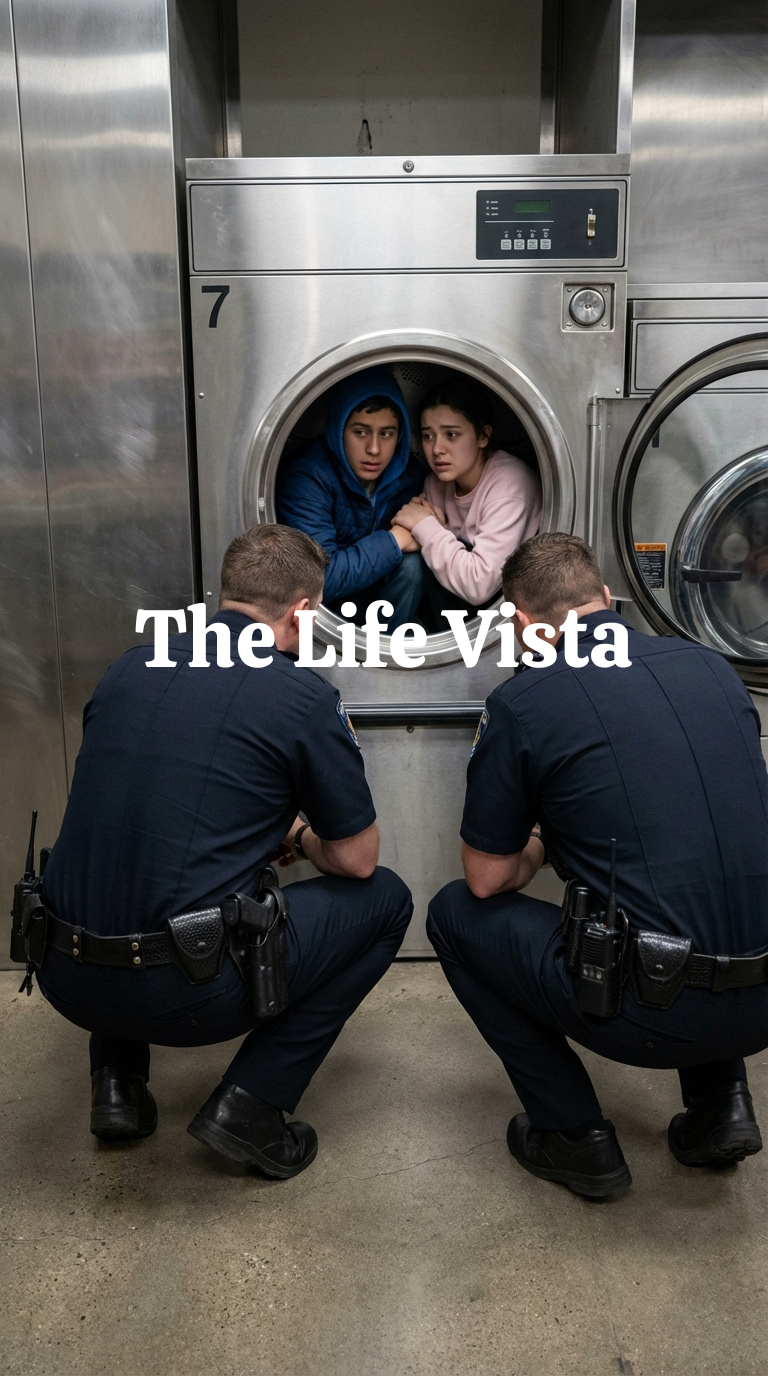 I nodded once and stepped forward slowly, boots echoing on tile. As I rounded the corner of the dryer, the shadows shifted. It wasn’t just sneakers. It was legs. Thin denim trembling so violently I could see the fabric shake. I crouched down enough to see faces.